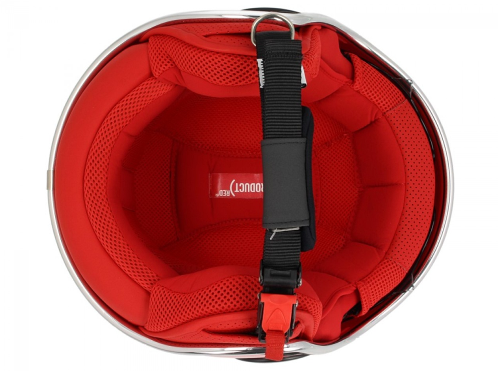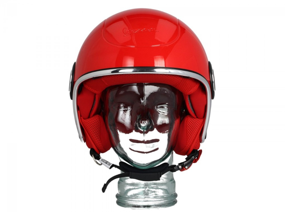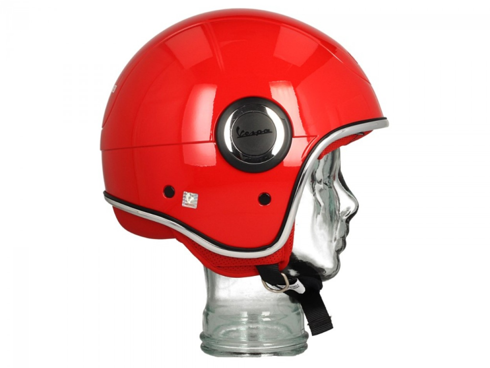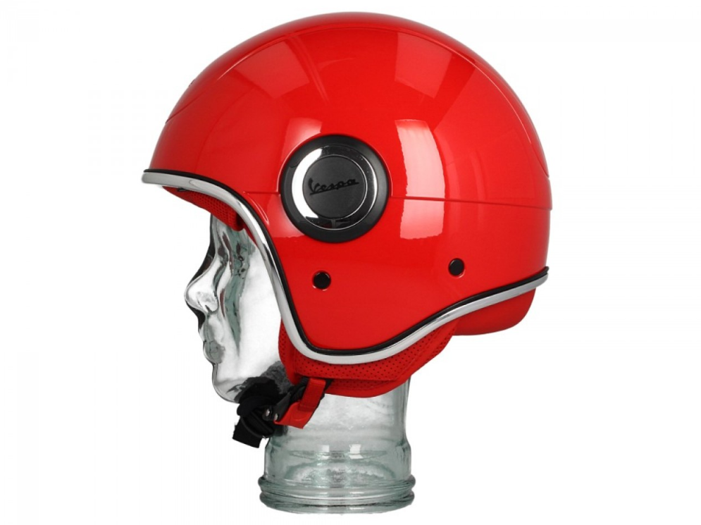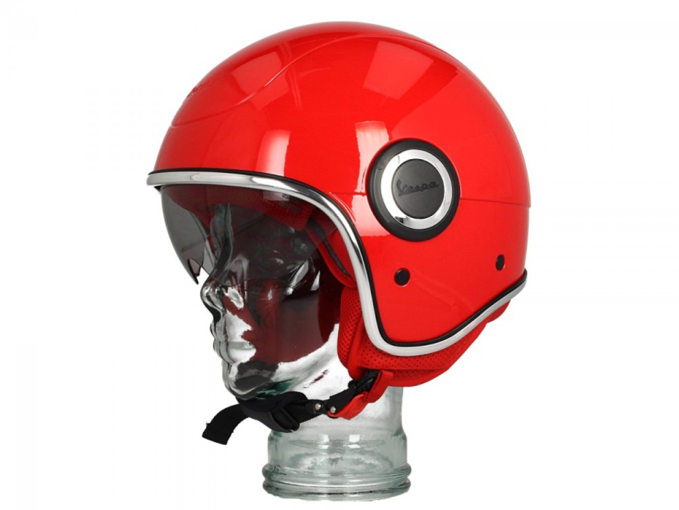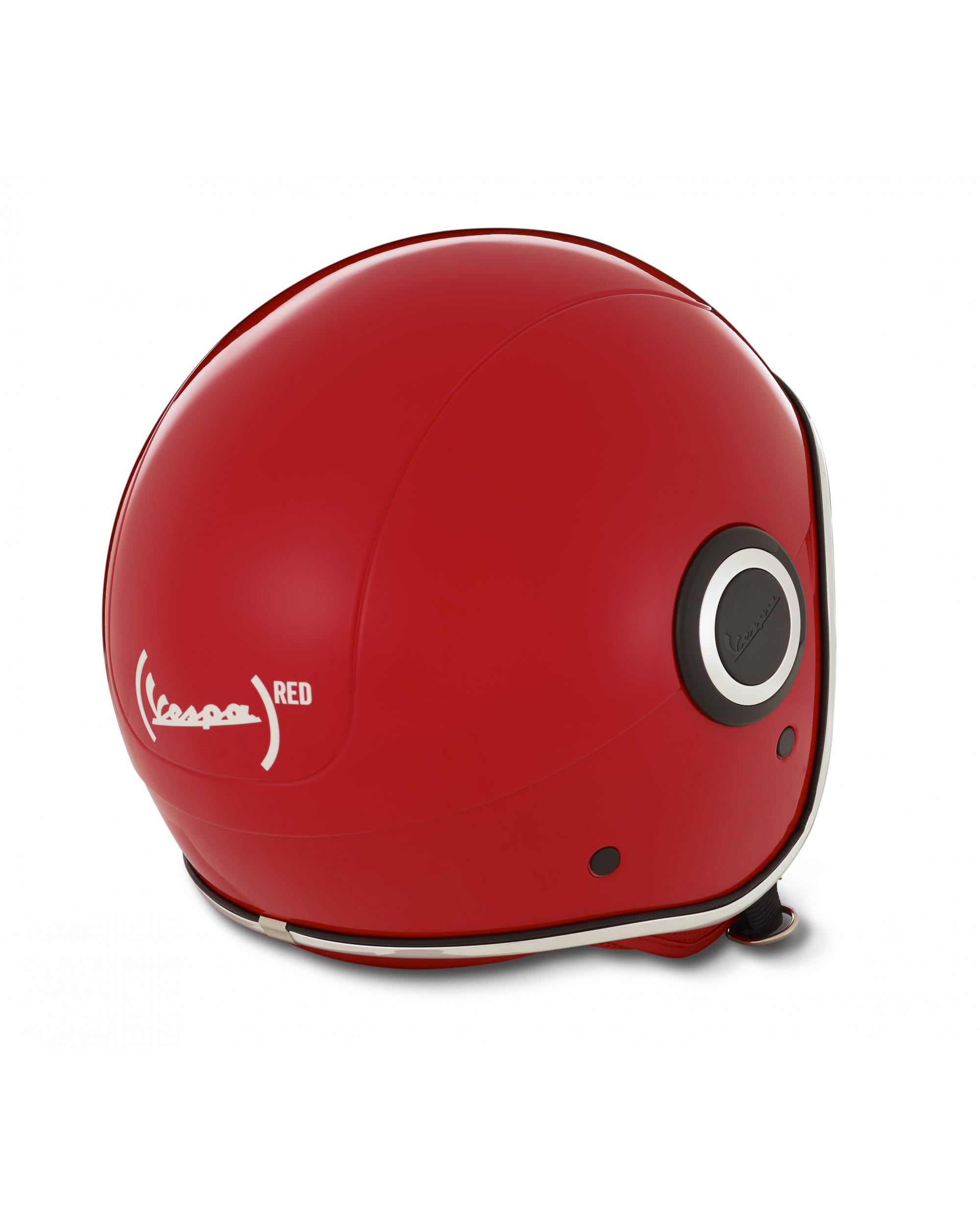 This helmet is unmistakably part of the Vespa collection! The combination of Vespa and (RED)® results in an exclusive helmet with refined details, such as B. the chrome-plated helmet border. The red inner lining made of absorbent microfibre is removable. The dark sun visor and the darts, which are matched to the material of the Vespa seat, complete the design. This is a product from the VESPA (RED)®