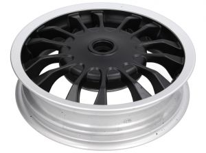 Sporty rear wheel rim in the look of the new Vespa Sprint, black / polished. (not for 2 stroke)